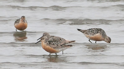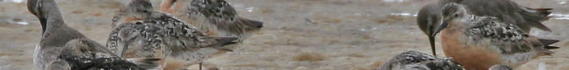 I had expected to see Red Knots by now, so I was starting to sweat a bit. A Peregrine Falcon treated us to extended looks as it sprinted by and then caught a thermal updraft with the help of which it soared in circles until it was too distant to watch. Shorebirds at Frank’s Dump were numerous, with large flocks of American Avocets, incoming Marbled Godwits, and a smattering of sandpipers, mostly Least Sandpipers. And no Red Knots. Yikes! So we turned our attention back to the bay to study the birds feeding along the edge of the incoming tide, and thank goodness, there were 3 Red Knots foraging steadily while trying to confuse us with their non-breeding plumage and by moving between equally non-descript Plovers and Willets. We located two more Red Knots, one of which had traces of orange coloring its chest and belly. Most? Some? A few? of the group agreed that indeed they were seeing orange and were convinced that they could now say they had seen a Red Knot! Big smiles all around.
